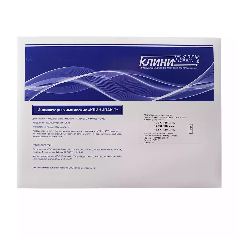 Индикатор стерилизации КЛИНИПАК-Т универсальный, 4 класс (120C/45мин.,126C/30мин.,132C/20мин), самоклеющийся, упаковка 1000 тестов, с журналом, для контроля внутри и снаружи, КЛИНИПАК (РОССИЯ)