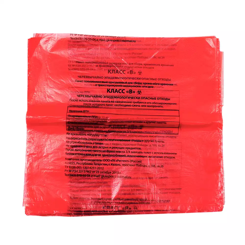 Пакет для сбора медицинских отходов, класс В, размер 600*1000мм, объем 100л, плотность 12 микрон, Респект ГК (РОССИЯ), 100 шт