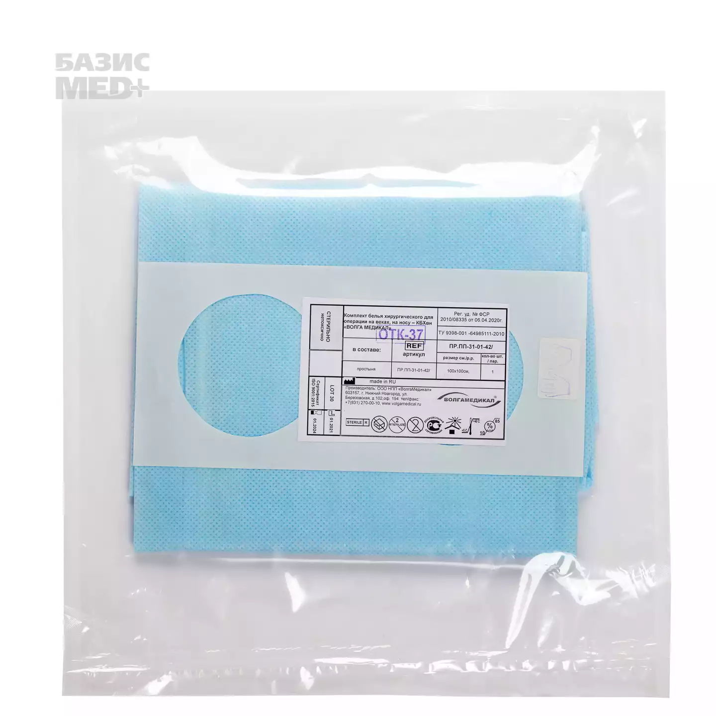 Простыня (наглазник), размер 100*100см, материал СМС 42г/м, отверстие 7см, с наружным карманом, опер. пленкой, стерильная, голубая, Волга Медикал НПП (РОССИЯ)
