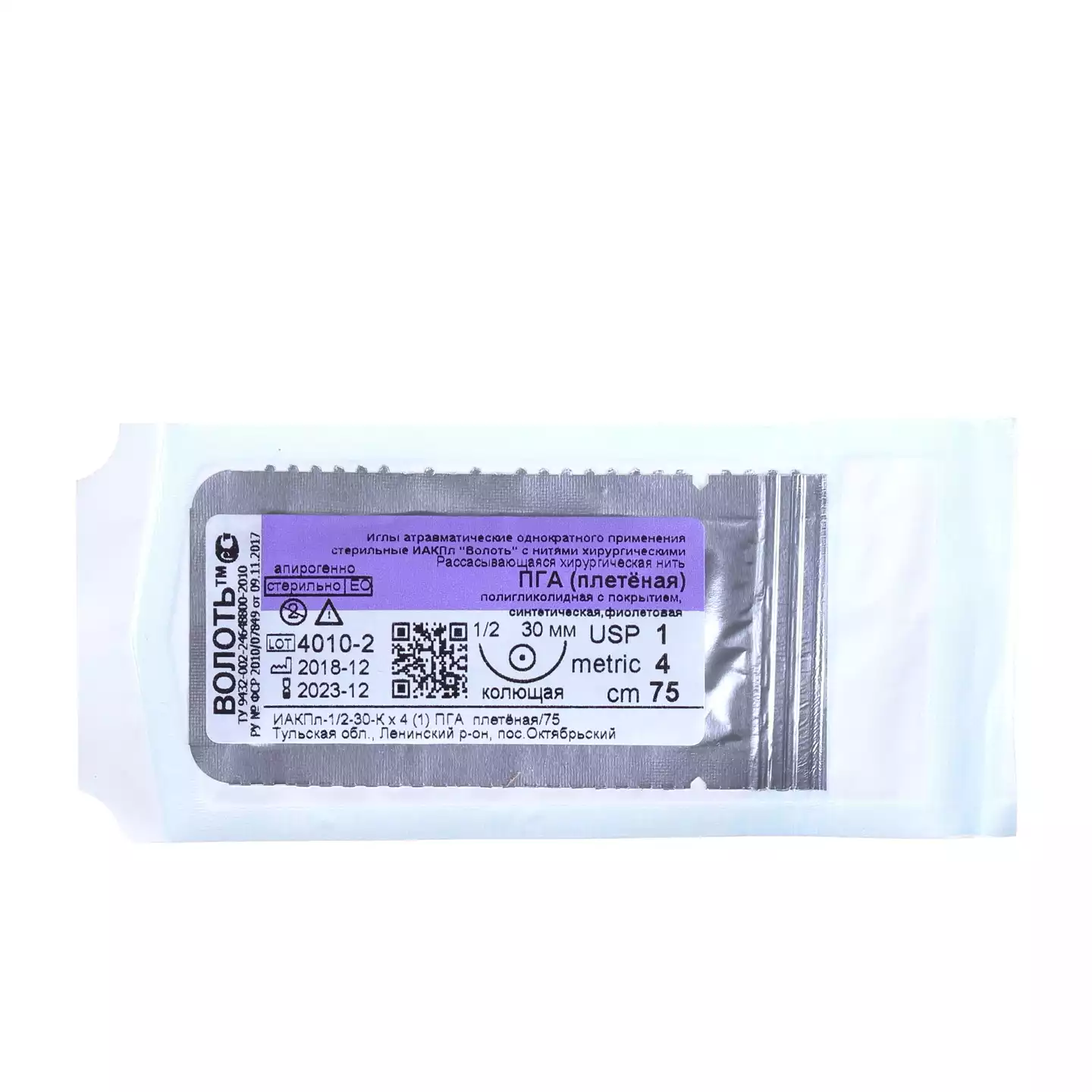 ПГА (PGA) плетеная, USP№1, длина 75см, игла 30мм, изгиб 1/2, колющая, одноигольная, Волоть (РОССИЯ)