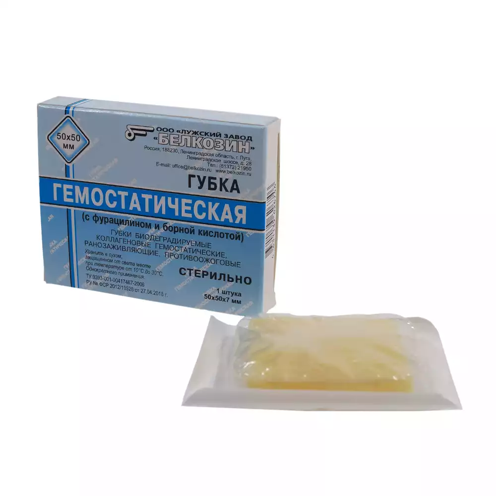 Губка (пластина) кровоостанавливающая, коллагеновая, размер 50х50мм, с фурацилином и борной кислотой, стерильная
