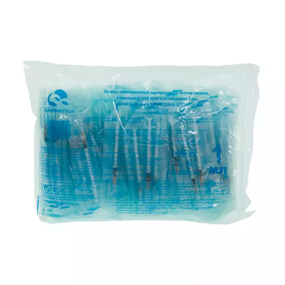 Шприц VANSUNTECH 1,0мл инъекционный, 3-х компонентный, игла 26G*1/2 (0,45*12мм), стерильный, 100 шт